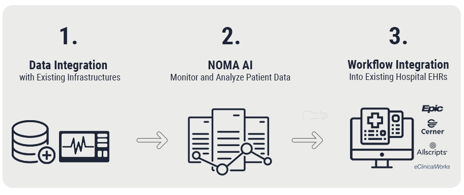 NOMA AI platform integrates with existing hospital IT and device infrastructures to monitor patients' data in real-time and provide predictive analytics and monitoring solution within the clinical and eletronic health records softwares used by the medical teams on the daily basis.