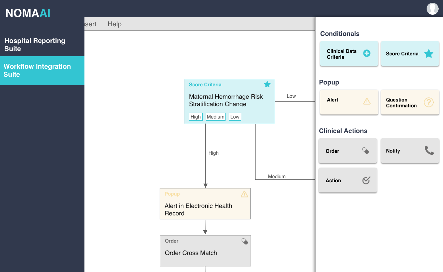 NOMA AI's clinical workflow integration suite is designed to maximize the usability and actionability of our clinical decision support tool by offering the tools to customize the workflow integrations of NOMA AI solutions with hospital-specific guidelines and protocols. The integrations allow hospital clinical leaders and safety committees to integrate real-time recommendations into our risk panels, enabling them to standardize and improve consistent implementation of care protocols.